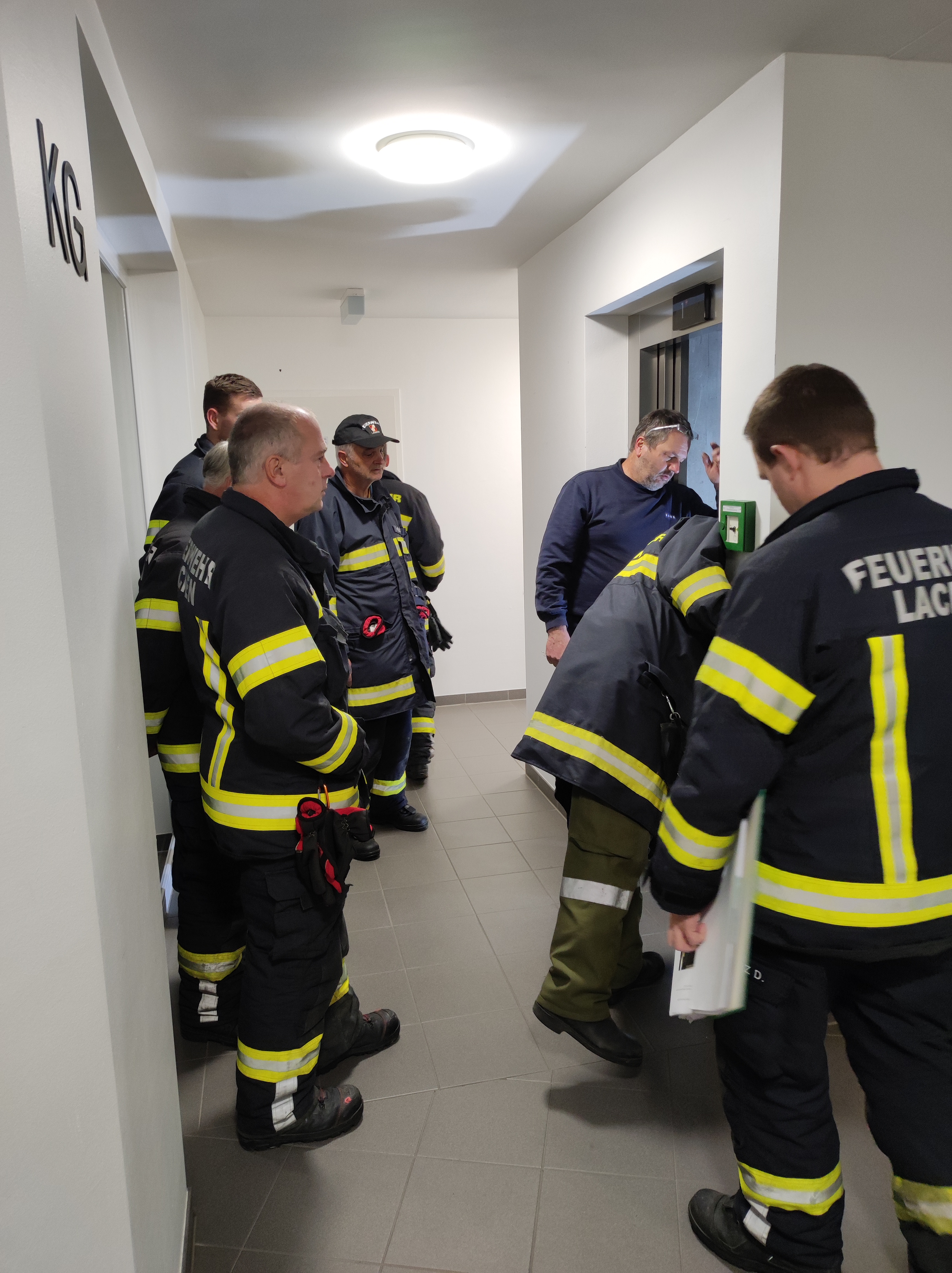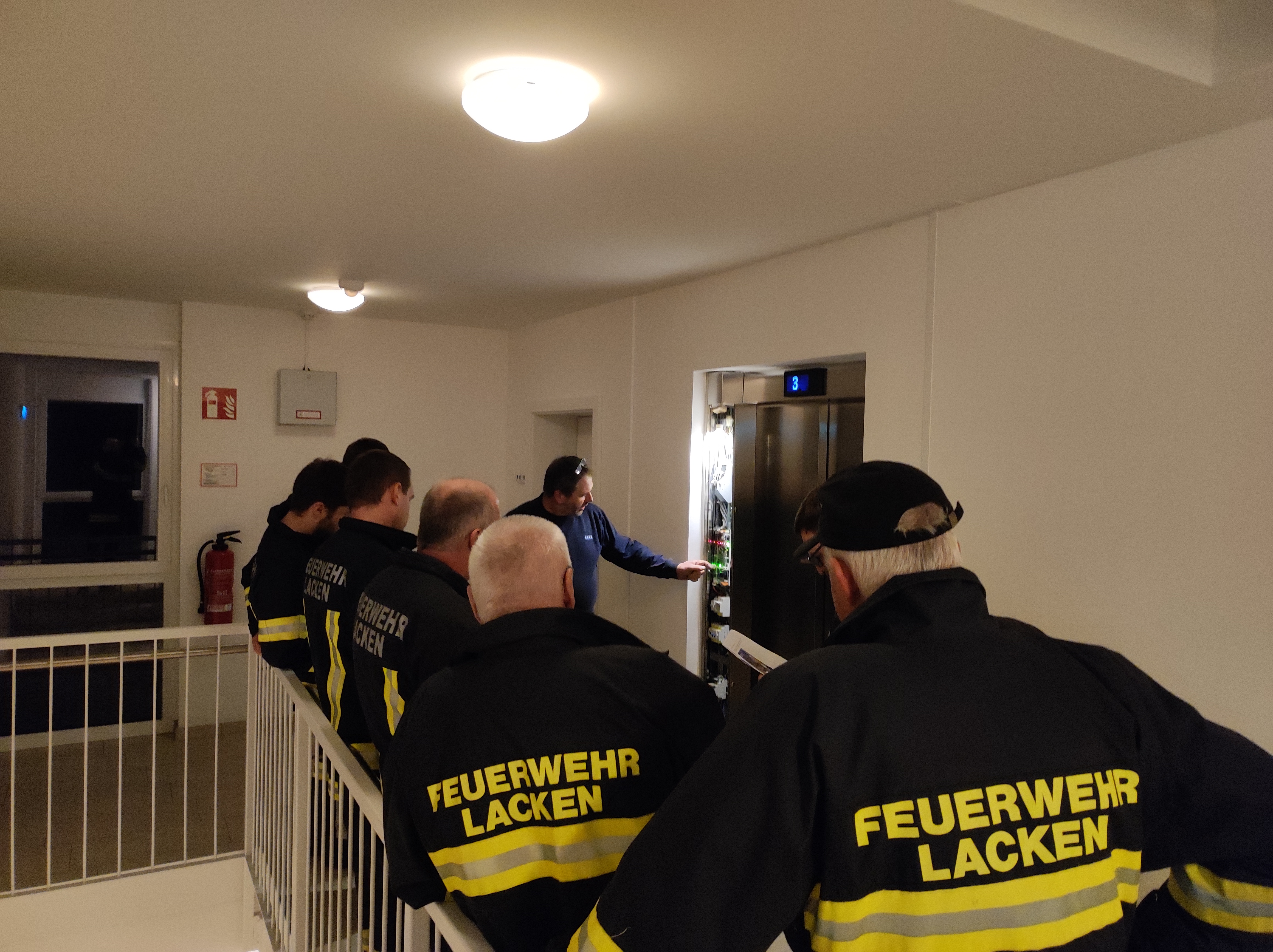 Zu Beginn wurden die Übungsteilnehmer in zwei gleich große Gruppen aufgeteilt. Während eine Gruppe im Feuerwehrhaus verblieb, begab sich die andere Gruppe in zwei Wohnhäuser in der Schatzsiedlung. Dort wurde mithilfe eines Technikers der Liftfirma KONE eine Personenbefreiung aus dem Lift sowohl theoretisch durchbesprochen als auch praktisch beübt. Da es in unserem Einsatzgebiet mittlerweile sehr viele Wohnbauten mit Liften verschiedener Liftfirmen gibt, ist es für uns wichtig, über jede Liftanlage genaustens Bescheid zu wissen, um im Ernstfall rasch helfen zu können.