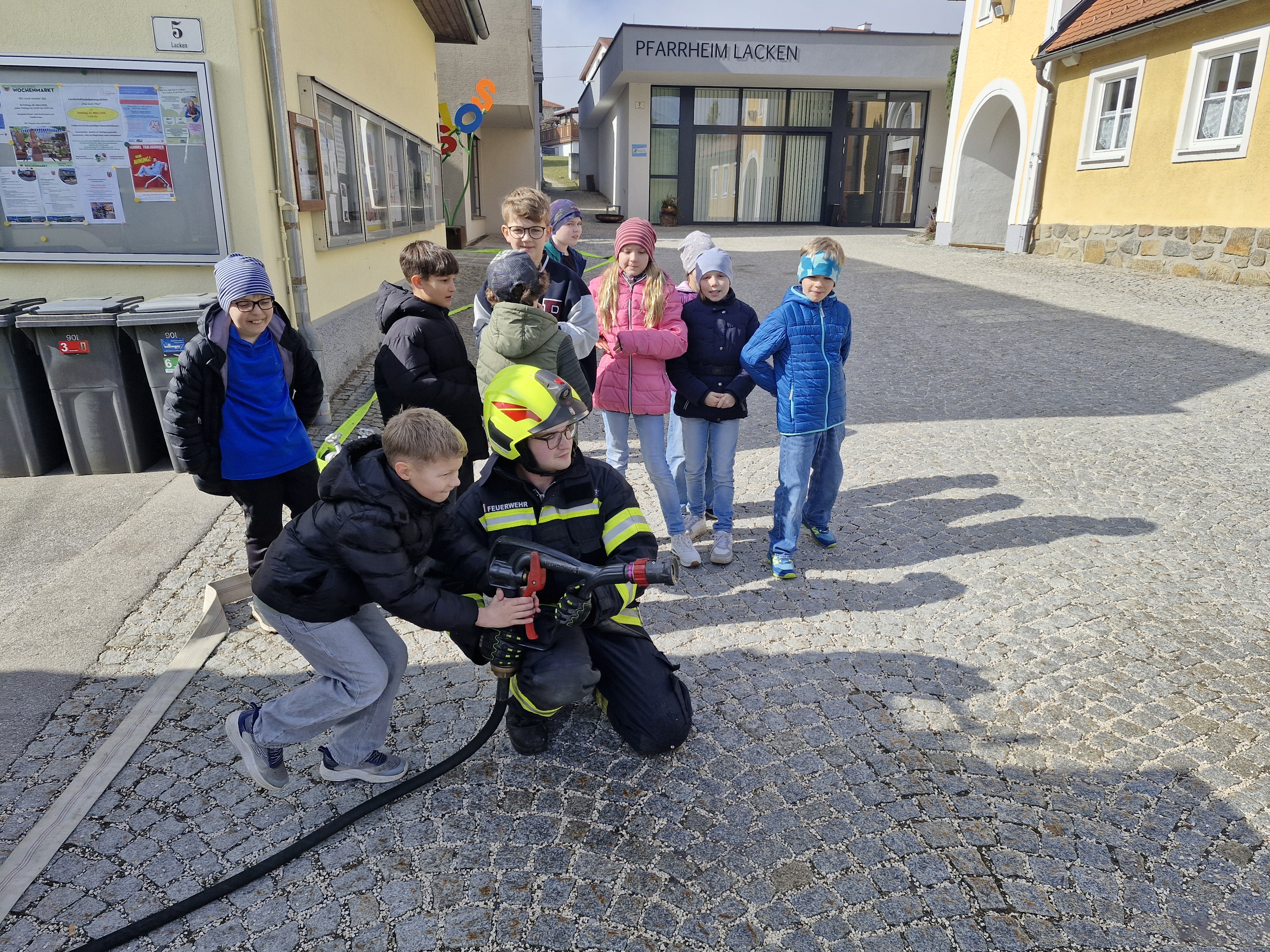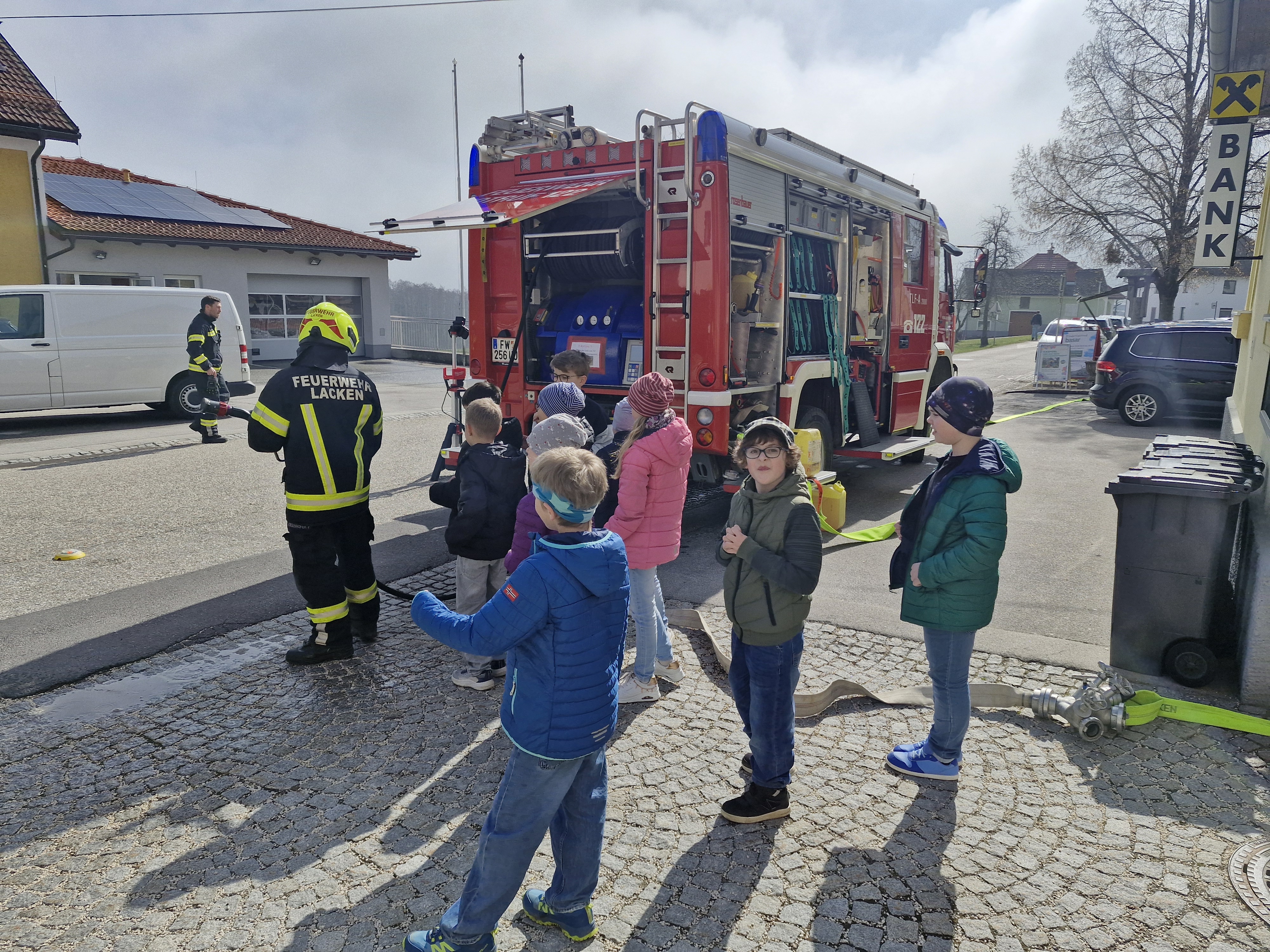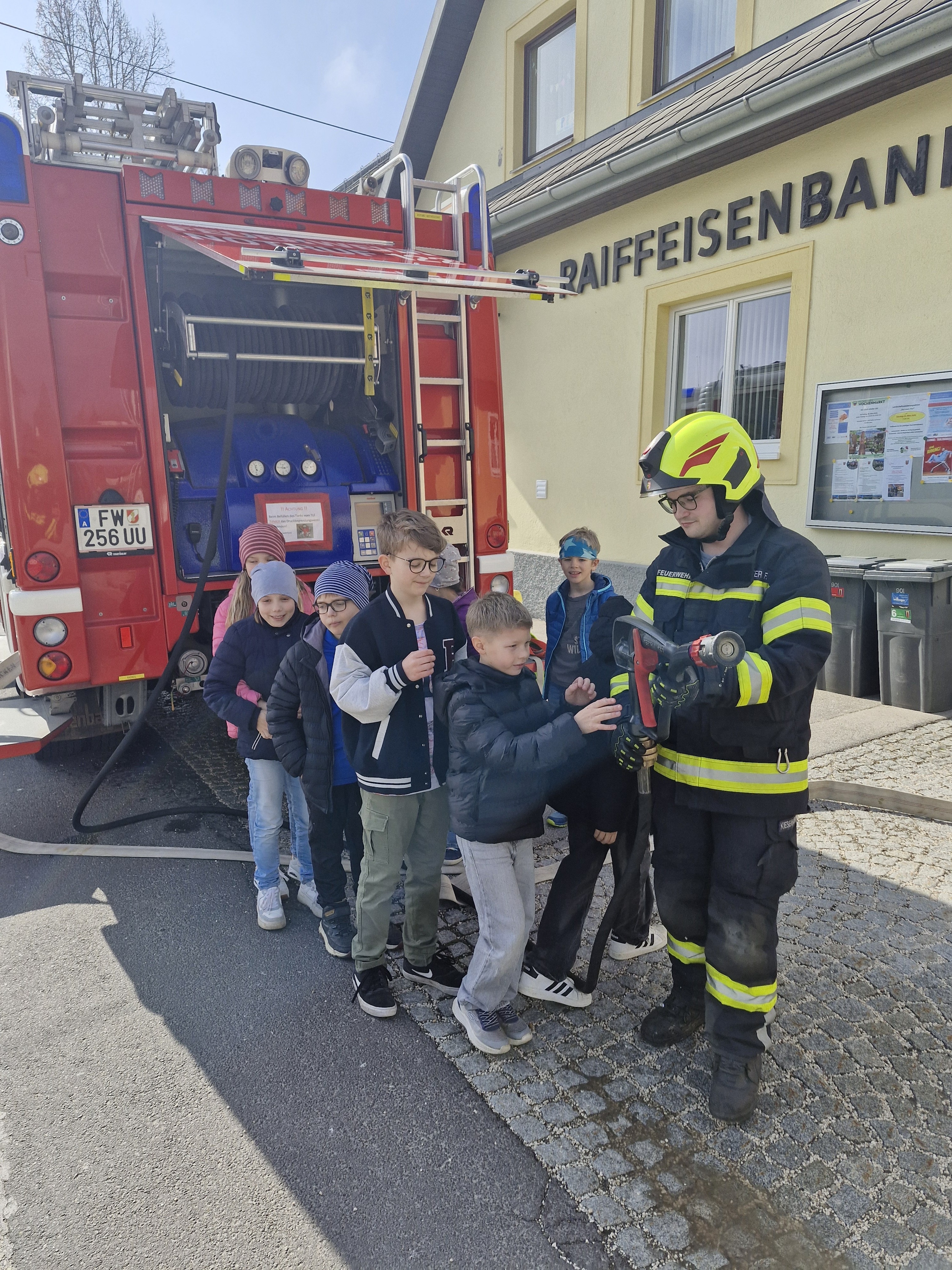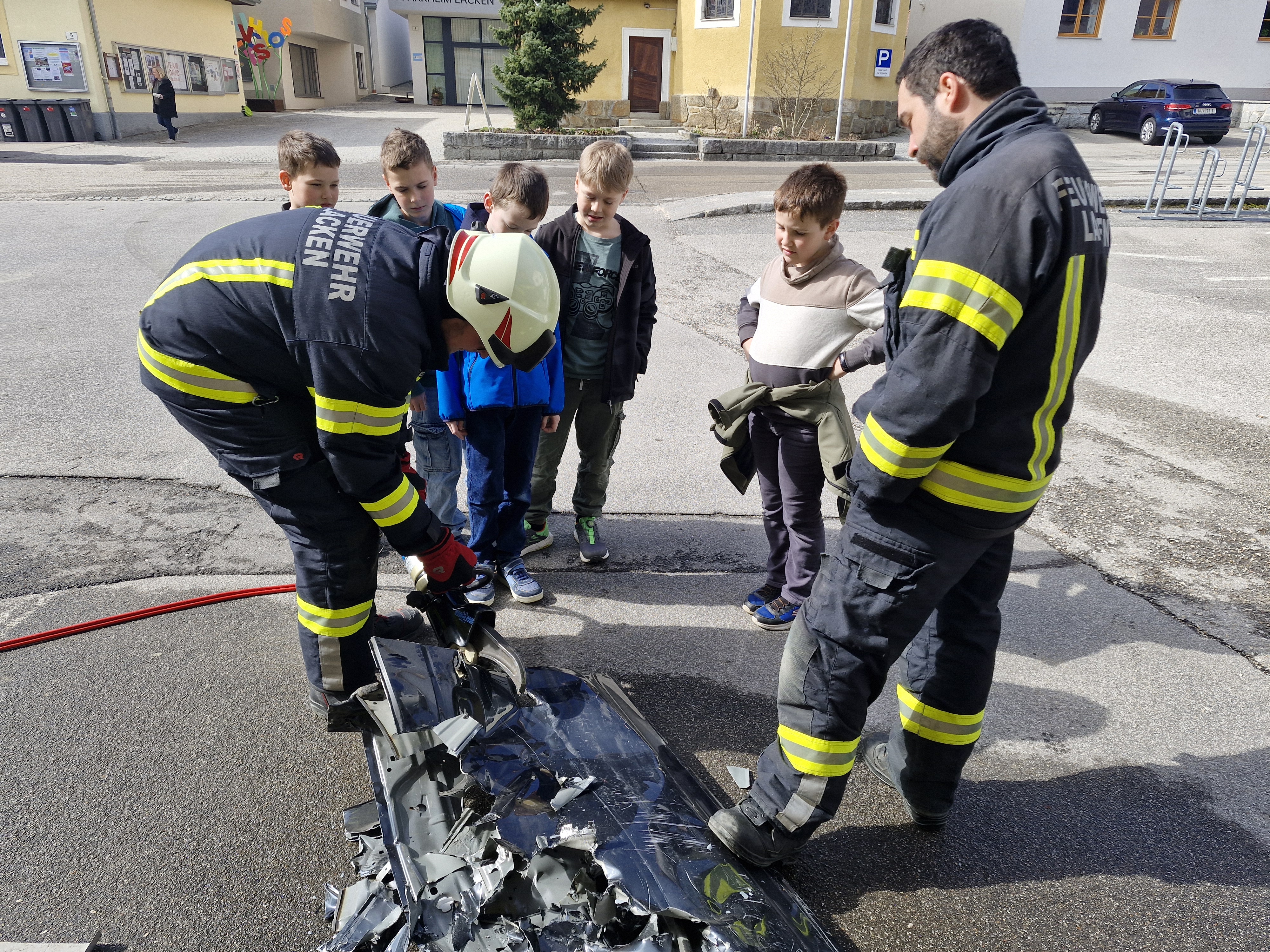 Im Rahmen einer realistisch gestalteten Feuerwehrübung gab es plötzlich Rauch in der Garderobe der Schule. Die Kinder der 2. Klasse mussten das Klassenzimmer über das Fenster verlassen und nach draußen klettern. Alle anderen verließen rasch das Schulhaus und gingen zum Sammelplatz. Danach warteten viele interessante Stationen auf die Kinder. Sie durften über eine Leiter klettern, mit der Wasserspritze spritzen und sogar mit einer hydraulischen Schere schneiden. Auch die Fahrt mit dem Feuerwehrauto war sehr aufregend. Die Übung war sehr lehrreich und machte allen bei schönem Wetter großen Spaß.