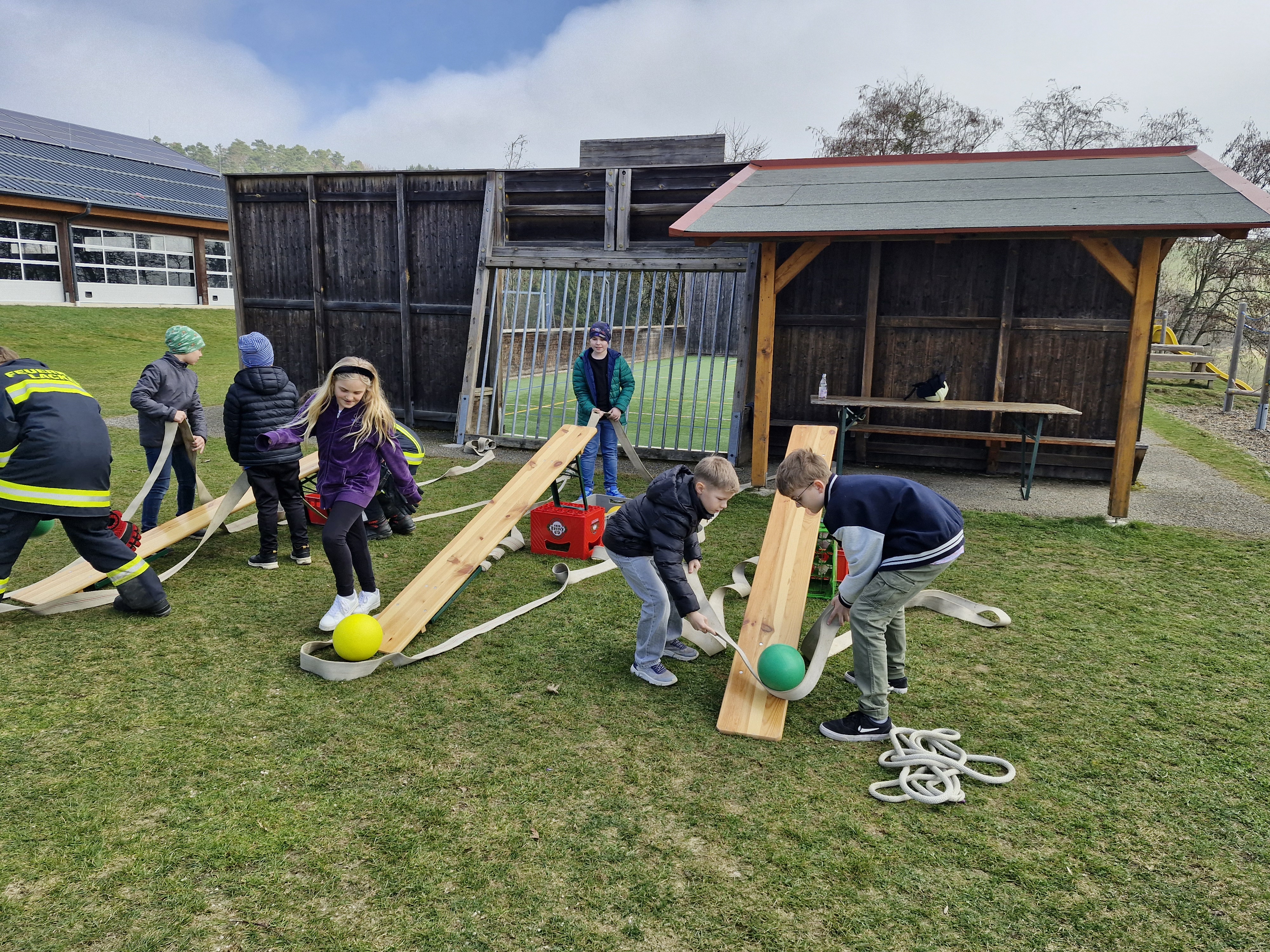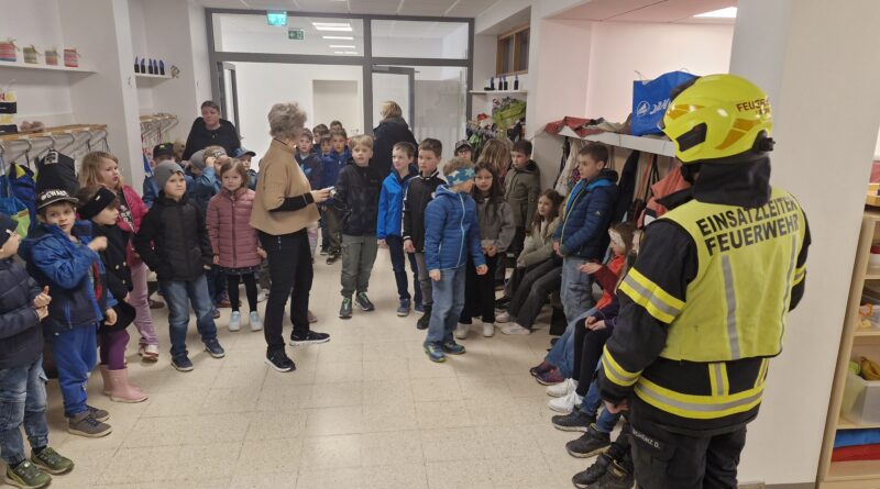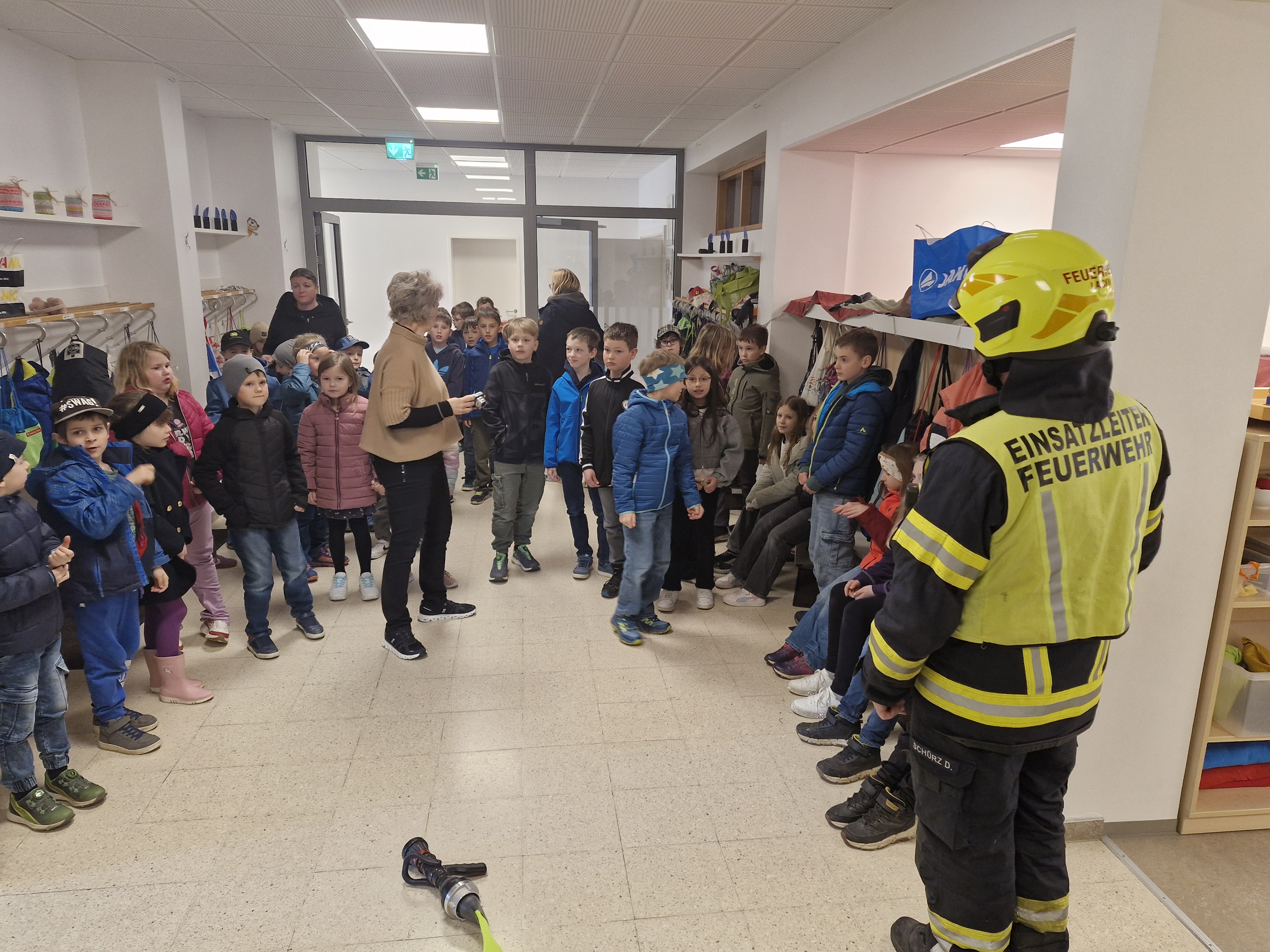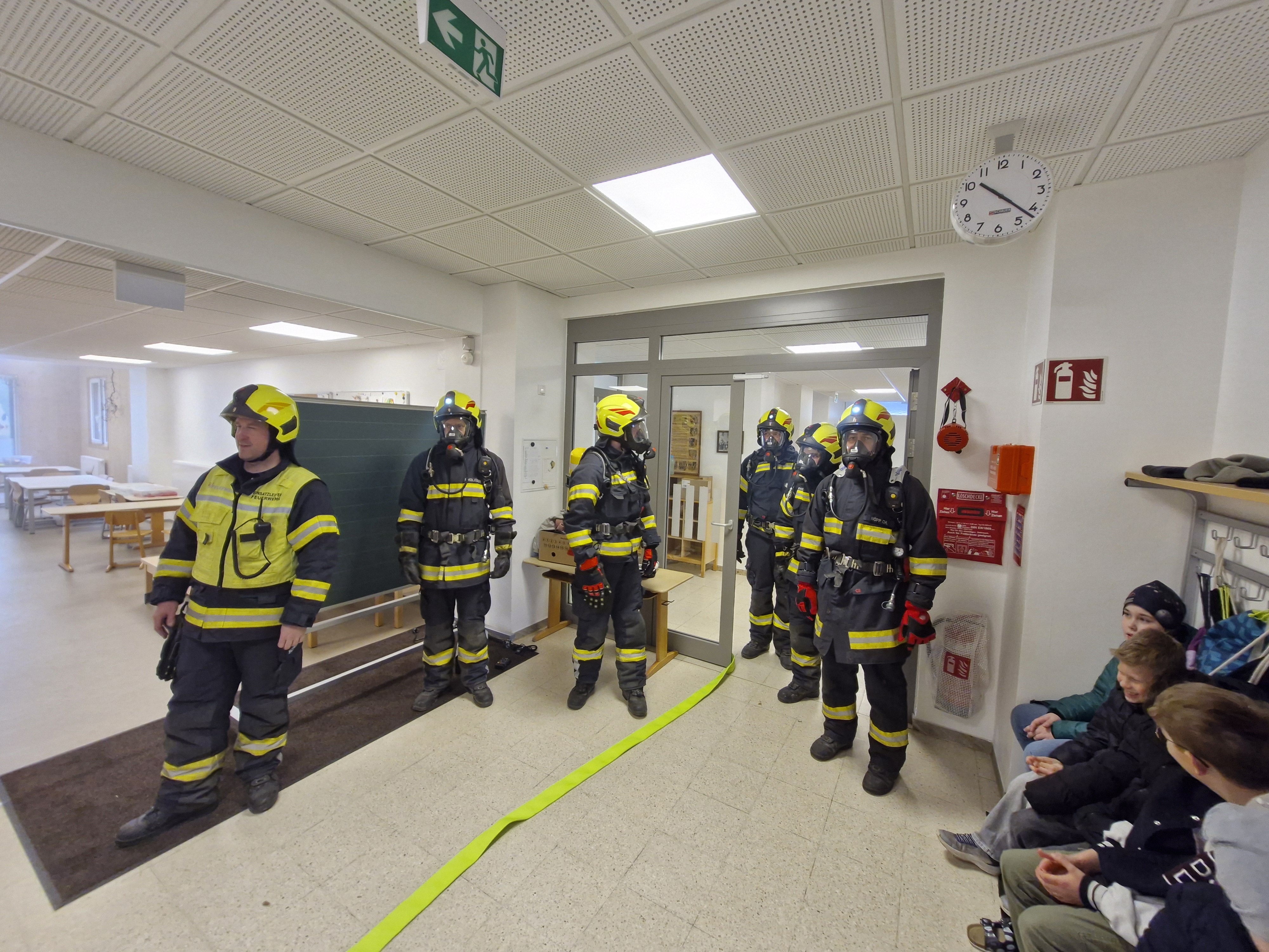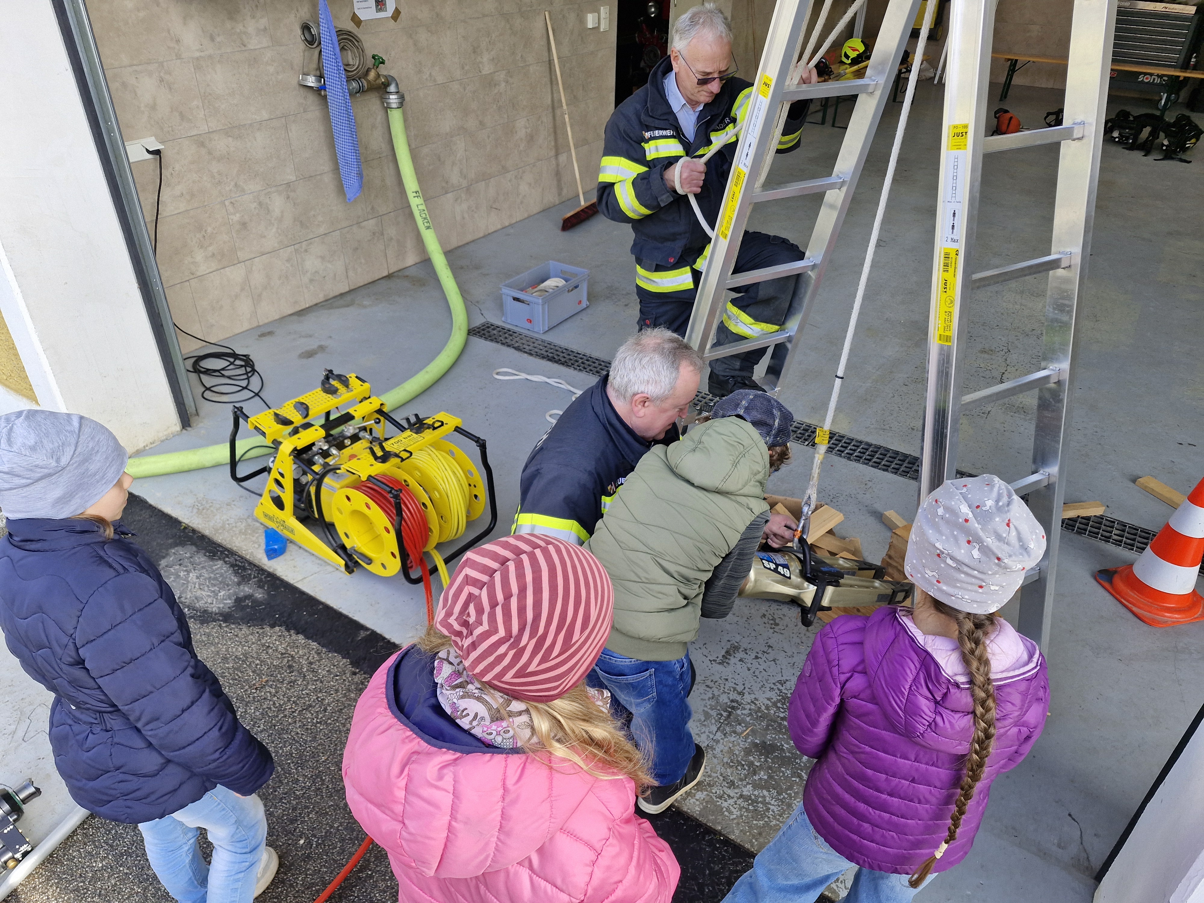 Im Rahmen einer realistisch gestalteten Feuerwehrübung gab es plötzlich Rauch in der Garderobe der Schule. Die Kinder der 2. Klasse mussten das Klassenzimmer über das Fenster verlassen und nach draußen klettern. Alle anderen verließen rasch das Schulhaus und gingen zum Sammelplatz. Danach warteten viele interessante Stationen auf die Kinder. Sie durften über eine Leiter klettern, mit der Wasserspritze spritzen und sogar mit einer hydraulischen Schere schneiden. Auch die Fahrt mit dem Feuerwehrauto war sehr aufregend. Die Übung war sehr lehrreich und machte allen bei schönem Wetter großen Spaß.
